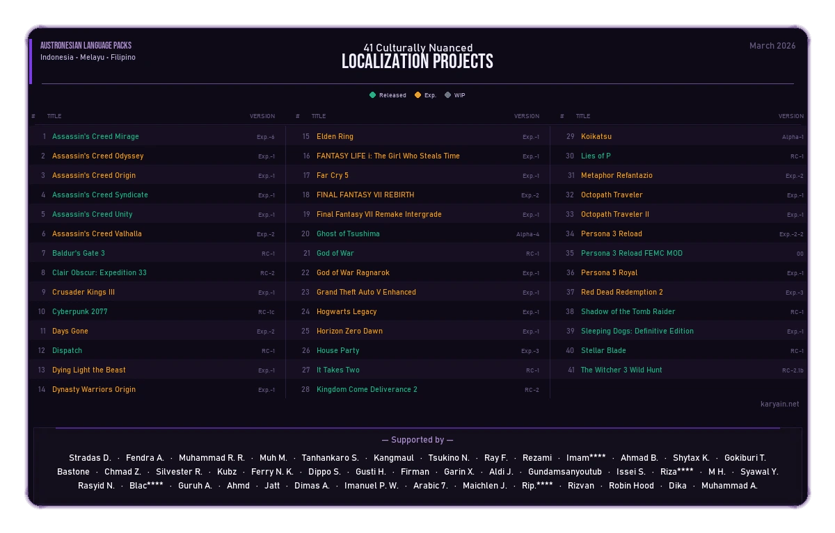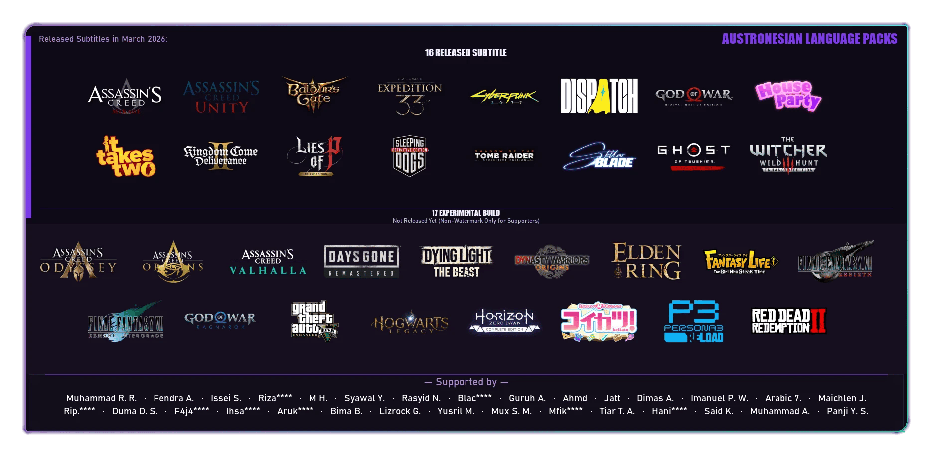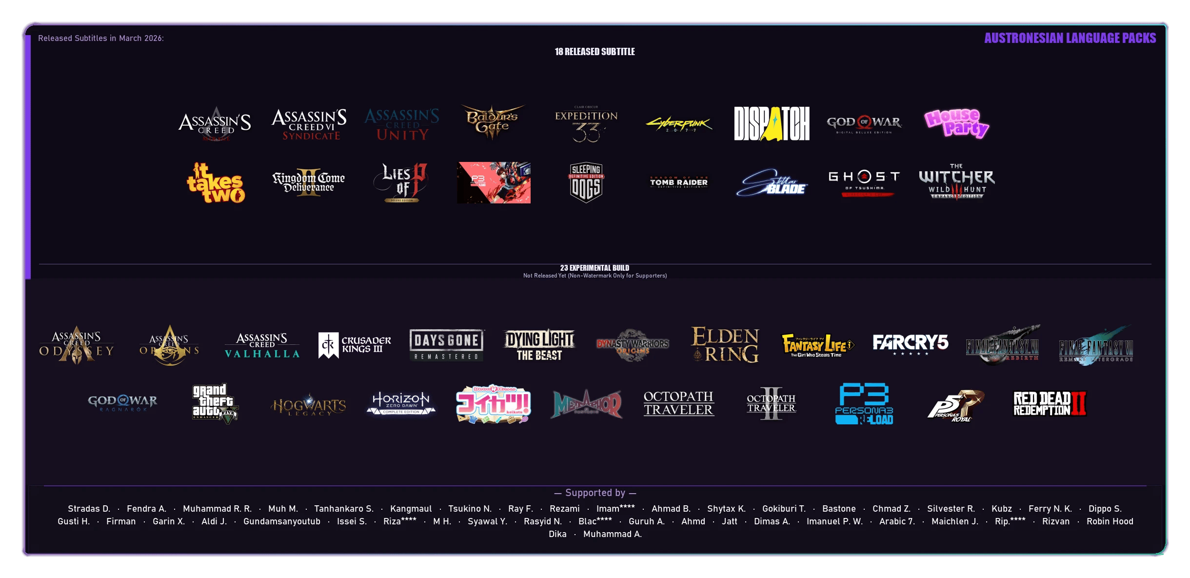 Welcome to the premier hub for Austronesian gaming localization, featuring free subtitles for AAA titles. Join the movement to make high-quality Indonesian, Malay, and Tagalog translations a gaming standard.