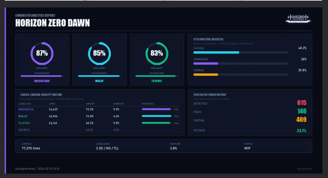 Uncover the massive technical feat behind translating Cyberpunk 2077. From 7 million token waves to complex nested gender tags, see how we localizing the neon nightmare for the Austronesian community.